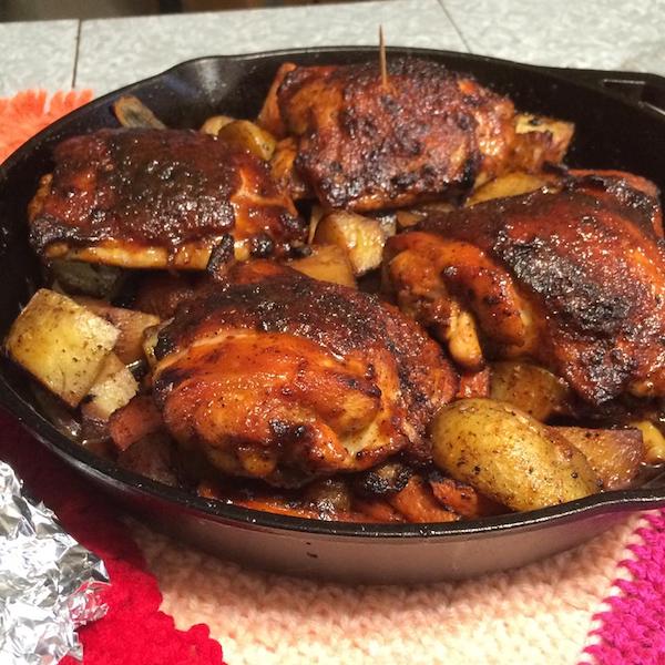 Original recipe: https://www.allrecipes.com/recipe/262185/cast-iron-honey-sriracha-glazed-chicken-with-roasted-root-vegetables/