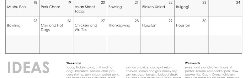 I’ll sit down at the end of the month and duplicate the previous month into a new document. I then go set the days up correctly and delete the previous month’s selections. From there I look at our family calendar coming up and mark out days where we know we aren’t going to cook. Bowling nights, football nights, etc. where half the family isn’t going to be around. We leave those as free-for-all nights and figure out something on the fly.