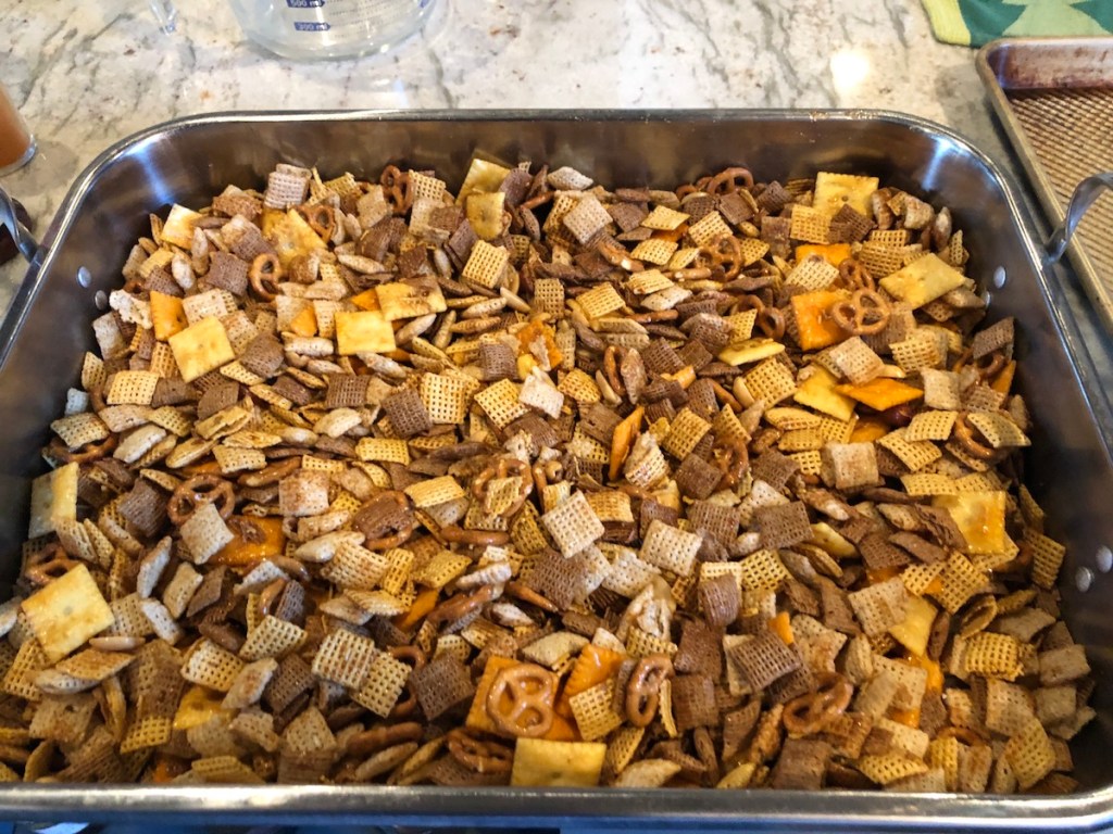 As soon as we get done with Thanksgiving, it’s Chex mix time. I think I make a good 8 or 10 batches of this stuff between Thanksgiving and Christmas and it accounts for at least a few pounds of holiday bulk around here. I’ve modified the original recipe slightly.