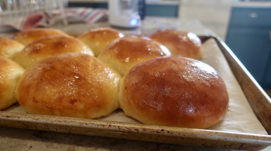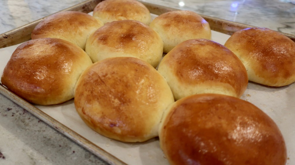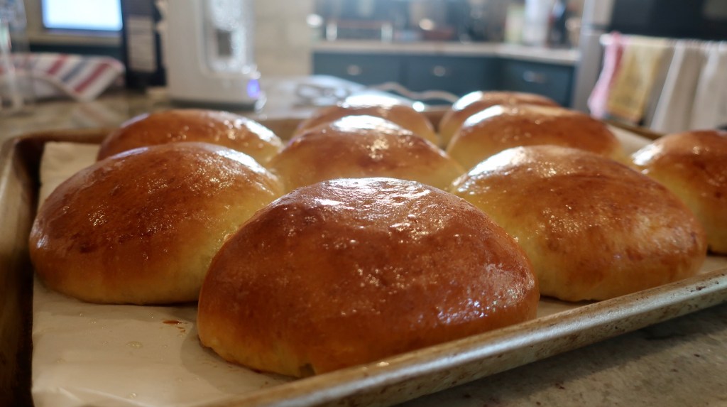 With all of this staying at home, I haven’t really tried anything new cooking-wise. I saw this video and we decided to give it a go. The result was amazing! The buns ended up being just the right texture, fluffy with a little crisp to them. The taste was slightly sweet, they remind me of Fuddruckers buns. Making them was not difficult, it just took some time. I upsized the recipe so the yield was 9, Zach is back in town and we have a lot of mouths to feed!